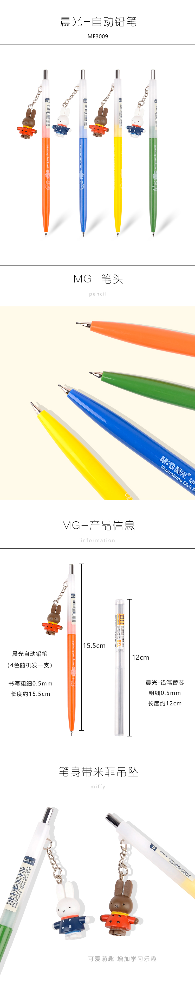 商品名称:晨光MF3009,米菲自动铅笔(1/50/1500)卡通可爱小兔吊坠儿童活动铅笔-0.5mm 商品编号:61.03.02.8101 品牌:晨光/M&G 上架时间:2017-08-18 商品毛重:0克 铅芯规格:0.5mm 包装方式:1/50/1500 起订量:50 如果您发现商品信息不准确,欢迎纠错;如果您发现有比51文具价格更低的,欢迎举报