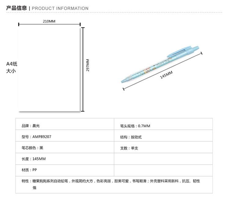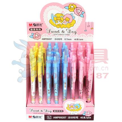商品名称:晨光AMP89207,0.7mm糖果狗狗活动铅笔(1/40/1200) 商品编号:61.03.02.89207 品牌:晨光/M&G 上架时间:2017-08-18 商品毛重:0克 笔杆材质:塑料杆 铅芯规格:0.7mm 包装方式:1/40/1200 如果您发现商品信息不准确,欢迎纠错;如果您发现有比51文具价格更低的,欢迎举报