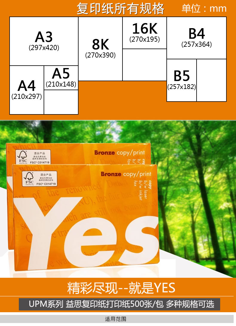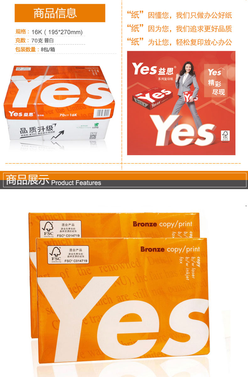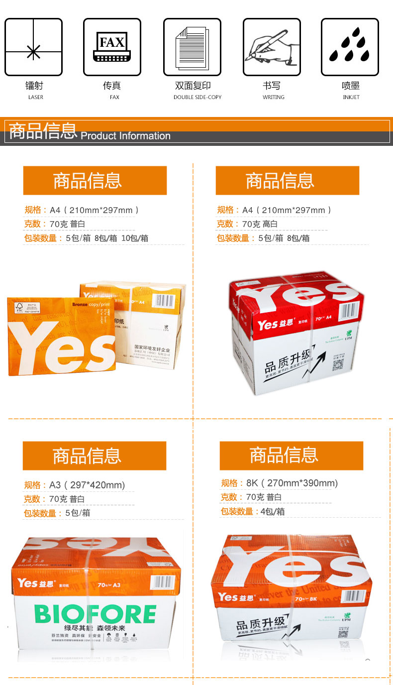 商品名称:UPM益思/yes,A3,70克普白复印纸(4包装),桔益思A3纸70G,打印纸/橙色包装 商品编号:63.01.01.0202 品牌:UPM 上架时间:2017-10-23 商品毛重:0克 标称克重:70g 包装量:4包装 规格:A3 价格单位:箱(4包) 如果您发现商品信息不准确,欢迎纠错;如果您发现有比51文具价格更低的,欢迎举报