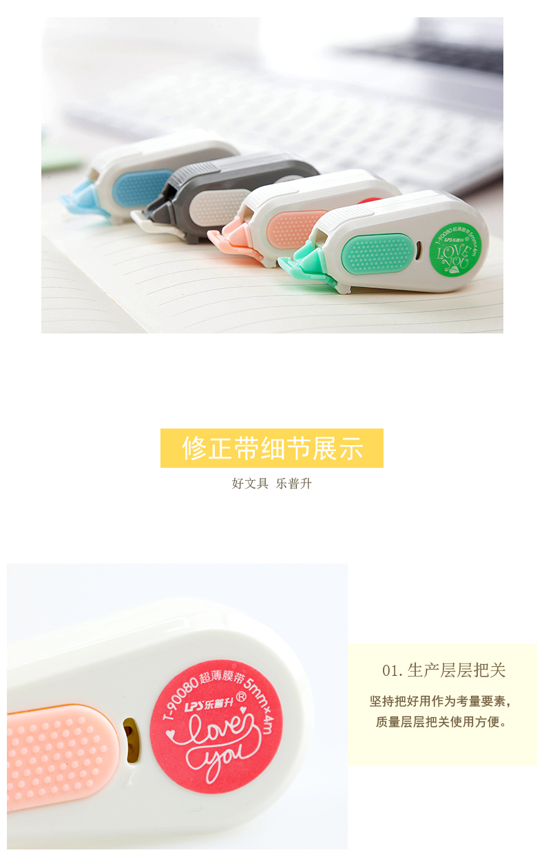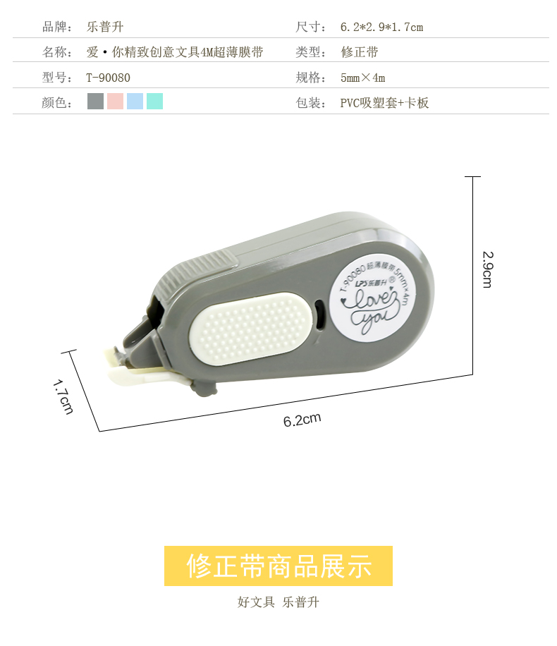 商品名称:乐普升90080,5mm*4m修正带创意文具改正带涂改带(爱你),T-90080 商品编号:68.01.01.90080 品牌:乐普升/LPS 上架时间:2017-11-13 商品毛重:0克 规格:5mm×4m 含量:1/24/576 如果您发现商品信息不准确,欢迎纠错;如果您发现有比51文具价格更低的,欢迎举报