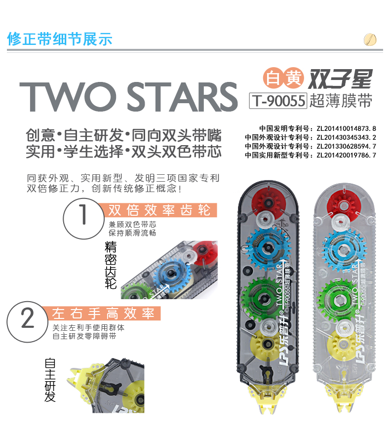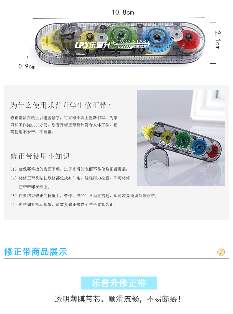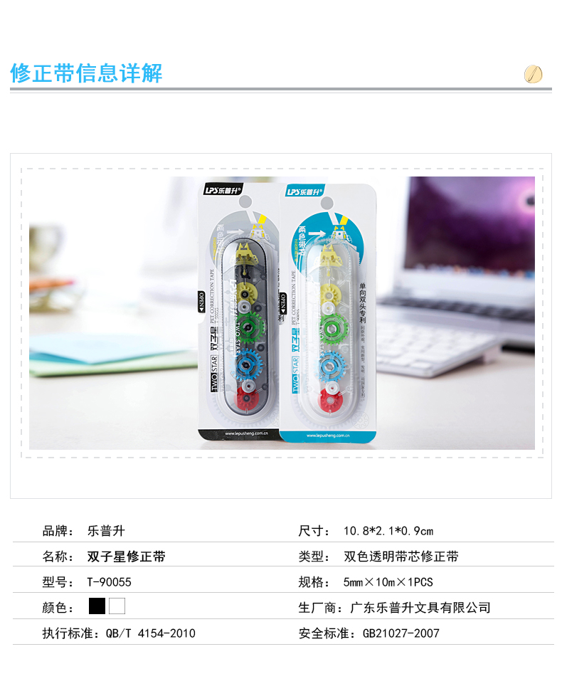 商品名称:乐普升90055,5mm*10m简约双头双色透明膜米黄色修正带改正带改错带(双子星),T-90055 商品编号:68.01.01.90055 品牌:乐普升/LPS 上架时间:2017-11-13 商品毛重:0克 规格:5mm×10m 含量:12/144/576 如果您发现商品信息不准确,欢迎纠错;如果您发现有比51文具价格更低的,欢迎举报