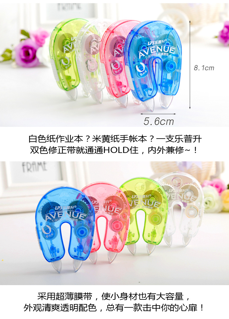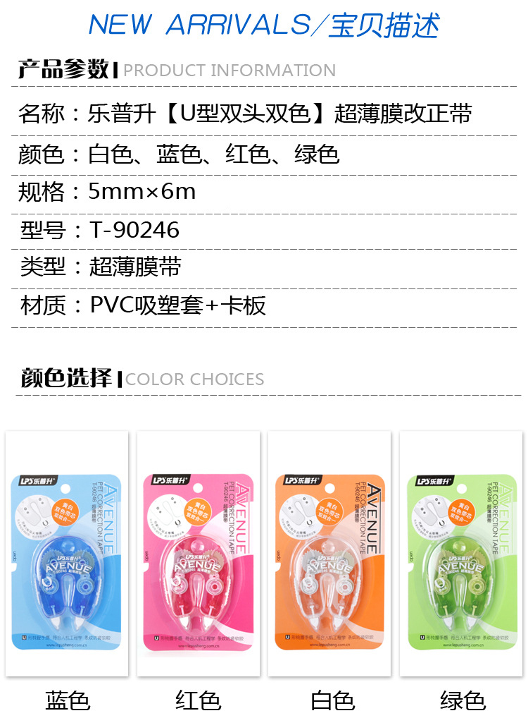 商品名称:乐普升90246,5mm*6m修正带【U型双头双色】超薄膜改正带创意文具涂改带,T-90246 商品编号:68.01.01.90246 品牌:乐普升/LPS 上架时间:2017-11-15 商品毛重:0克 规格:5mm*6m 含量:1/24/576 如果您发现商品信息不准确,欢迎纠错;如果您发现有比51文具价格更低的,欢迎举报