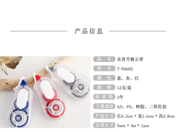 商品名称:乐普升90682,修正带蓝灰红可爱创意进口4M带芯小巧可调节涂改液,T-90682 商品编号:68.01.01.90682 品牌:乐普升/LPS 上架时间:2017-11-16 商品毛重:0克 规格:5mm*4m 含量:12/144/576 如果您发现商品信息不准确,欢迎纠错;如果您发现有比51文具价格更低的,欢迎举报