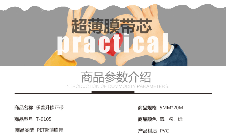 商品名称:乐普升9105,5mm*20m修正带薄膜带大容量学生改正带涂改带20m塑料带,T-9105 商品编号:68.01.01.9105 品牌:乐普升/LPS 上架时间:2017-11-16 商品毛重:0克 规格:5mm*20m 含量:12/144/576 如果您发现商品信息不准确,欢迎纠错;如果您发现有比51文具价格更低的,欢迎举报