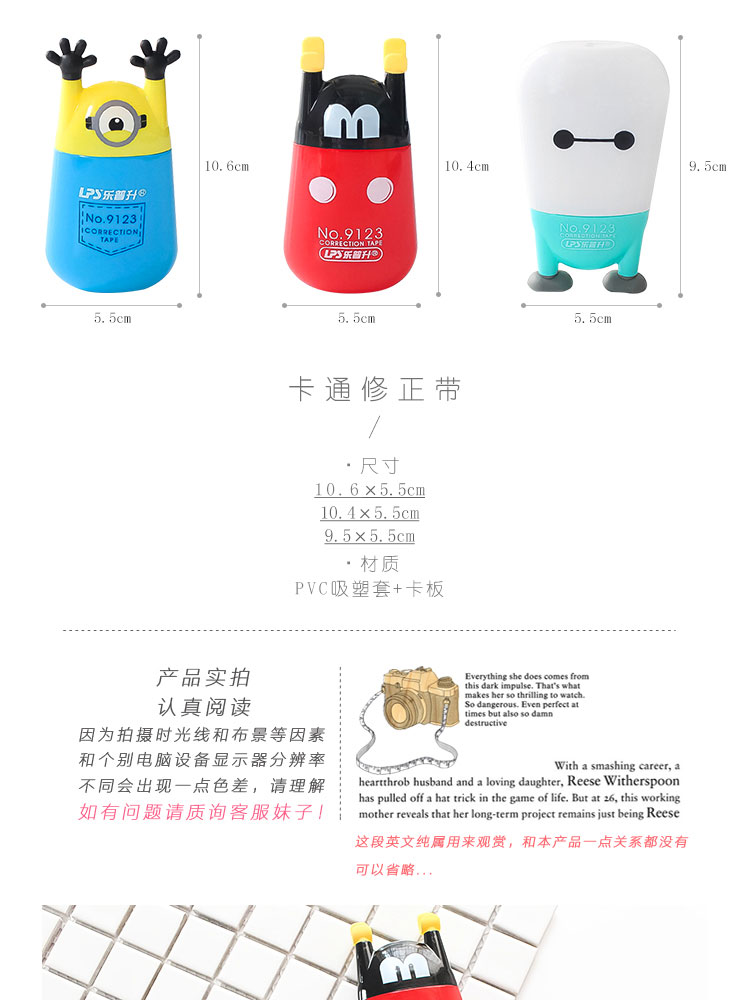 商品名称:乐普升9123,5mm*12m修正带/卡通可爱小黄人修正带进口带芯12m(欢乐反斗),T-9123 商品编号:68.01.01.9123 品牌:乐普升/LPS 上架时间:2017-11-16 商品毛重:0克 规格:5mm*12m 含量:1/24/576 如果您发现商品信息不准确,欢迎纠错;如果您发现有比51文具价格更低的,欢迎举报