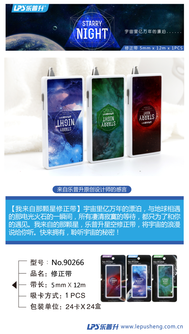 商品名称:乐普升90266,5mm*12m推动式学生文具12M修正带/涂改带(宇宙里亿万年的漂泊),T-90266 商品编号:68.01.01.90266 品牌:乐普升/LPS 上架时间:2017-11-16 商品毛重:0克 规格:5mm*12m 含量:1/24/576 如果您发现商品信息不准确,欢迎纠错;如果您发现有比51文具价格更低的,欢迎举报