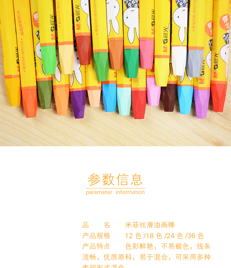 商品名称:晨光FGM90057,18色米菲丝滑油画棒 商品编号:61.06.02.0057 品牌:晨光/M&G 上架时间:2017-11-21 商品毛重:0克 颜色数:18色 包装含量:1/12/96 价格单位:盒 起批量:中包(12盒) 如果您发现商品信息不准确,欢迎纠错;如果您发现有比51文具价格更低的,欢迎举报