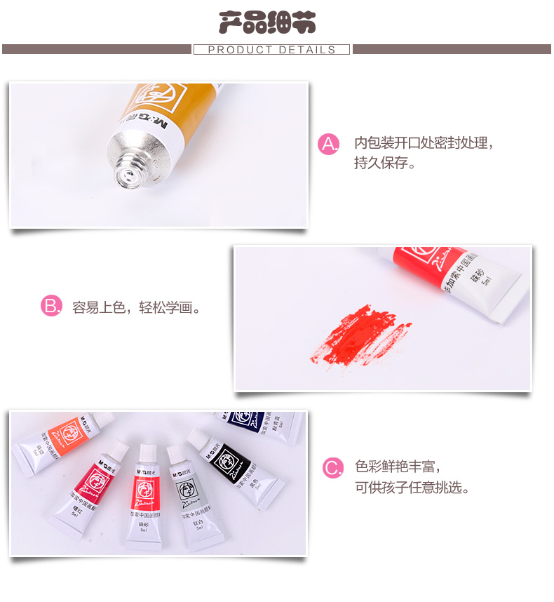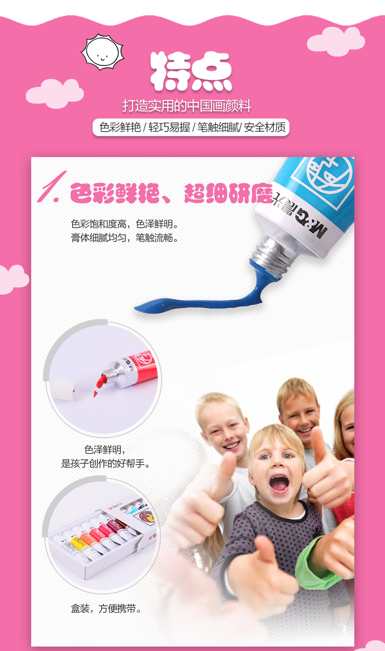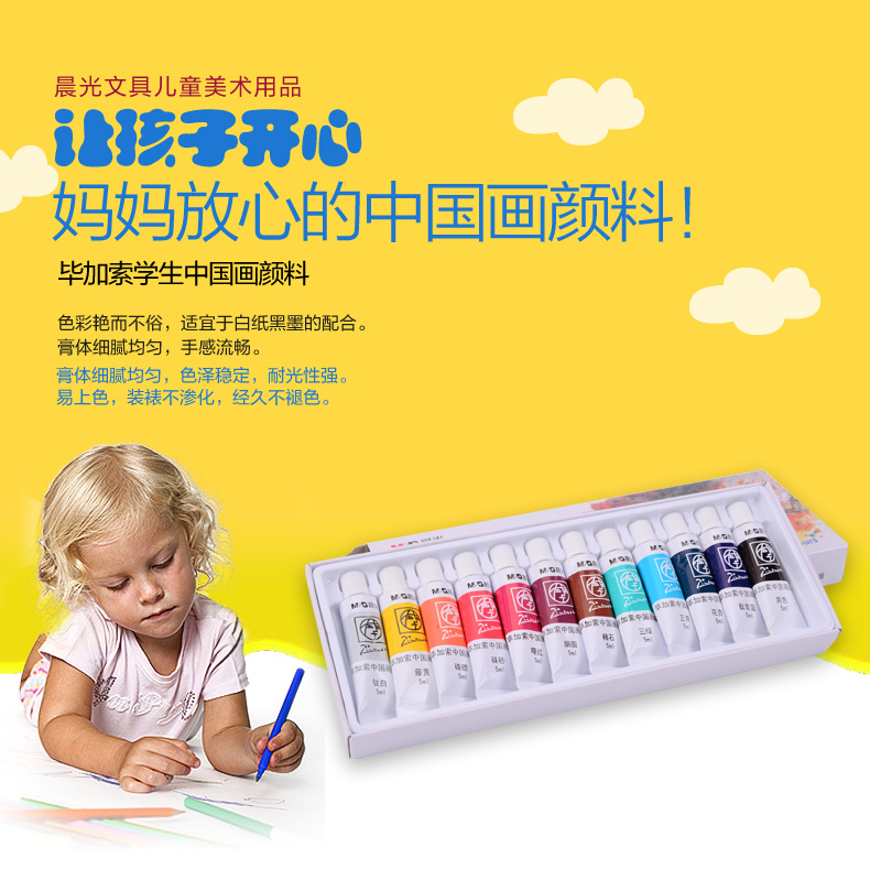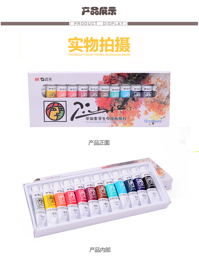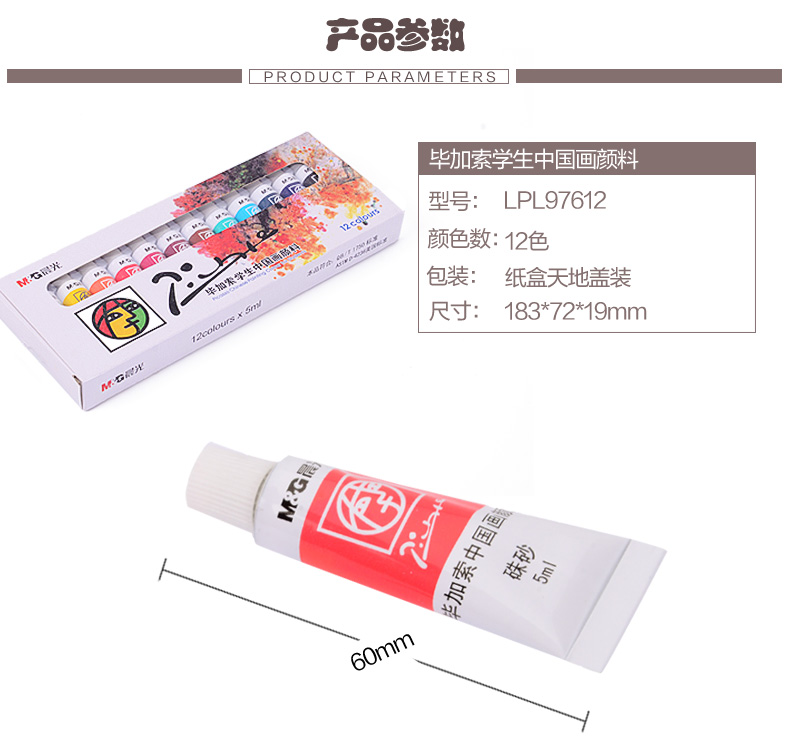 商品名称:晨光LPL97612,12色学生中国画颜料 商品编号:61.06.11.97612 品牌:晨光/M&G 上架时间:2017-12-11 商品毛重:0克 颜色数:12色 包装含量:1/12/72 价格单位:盒 如果您发现商品信息不准确,欢迎纠错;如果您发现有比51文具价格更低的,欢迎举报