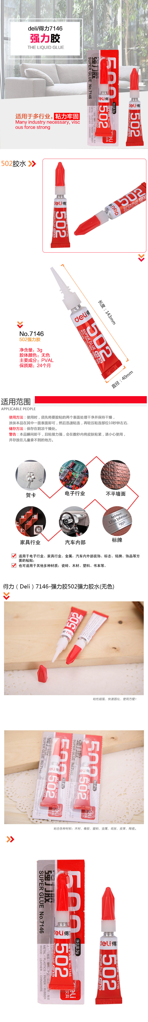商品名称:得力7146,3g卡装502强力胶水(8/192/384),3g/支 商品编号:12.02.17.7146 品牌:文具/LZN 上架时间:2017-12-11 商品毛重:0克 价格单位:支 包装量:8/128/384 起批量:板(8支) 如果您发现商品信息不准确,欢迎纠错;如果您发现有比51文具价格更低的,欢迎举报