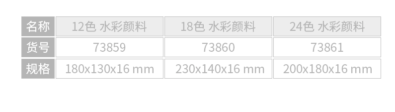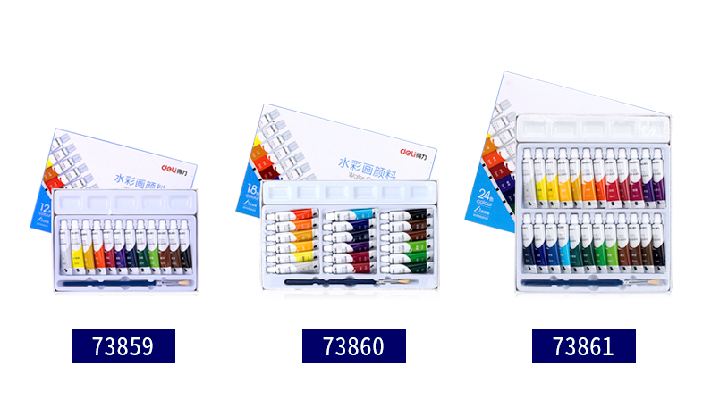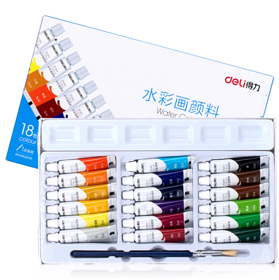 商品名称:得力73860, 水彩颜料套装/5ml绘画颜料 儿童美术水彩广告画学生美术颜料水彩18色 商品编号:12.11.44.73860 品牌:得力/deli 上架时间:2018-01-14 商品毛重:0克 颜色数:18色 包装含量:1/12/72 如果您发现商品信息不准确,欢迎纠错;如果您发现有比51文具价格更低的,欢迎举报