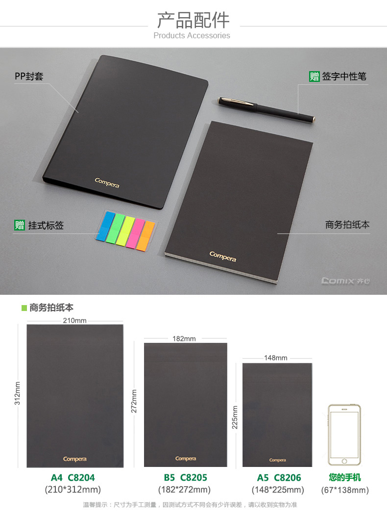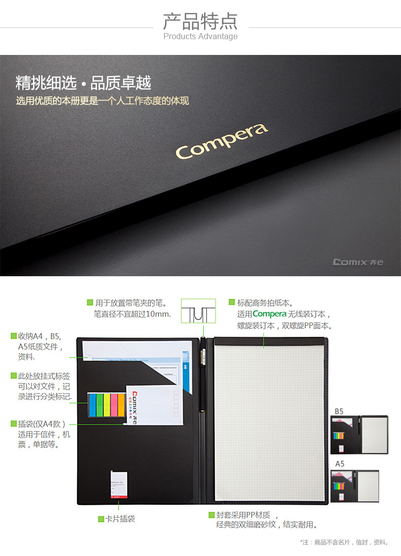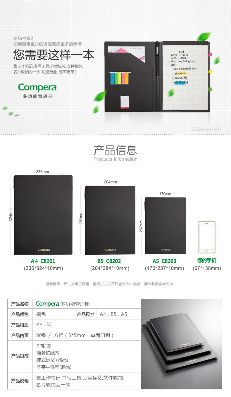 商品名称:齐心8201, Compera多功能管理册A4,经理包 商品编号:13.05.02.8201 品牌:齐心/COMIX 上架时间:2018-03-26 商品毛重:0克 产品类型:活页本 规格:A4 封面材质:PP 含量:1/5/30 如果您发现商品信息不准确,欢迎纠错;如果您发现有比51文具价格更低的,欢迎举报