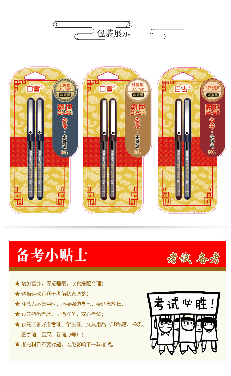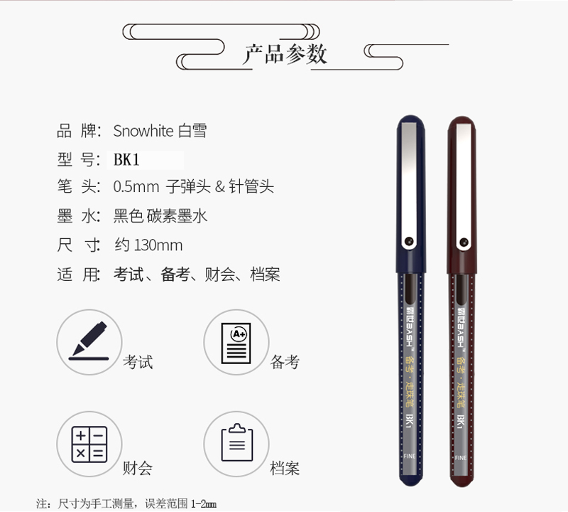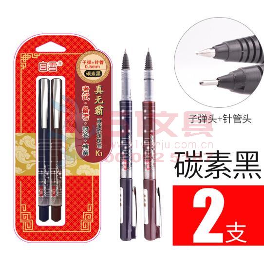 商品名称:白雪BK1, 考试笔碳素笔(2支卡装笔)直液式走珠笔碳素黑色0.5mm考试笔中性笔K1 子弹头/全针管型 商品编号:15.01.01.0001 品牌:白雪/SNOWHITE 上架时间:2018-04-21 商品毛重:0克 价格单位:卡 笔头粗细:0.5mm 包装含量:1/480 如果您发现商品信息不准确,欢迎纠错;如果您发现有比51文具价格更低的,欢迎举报