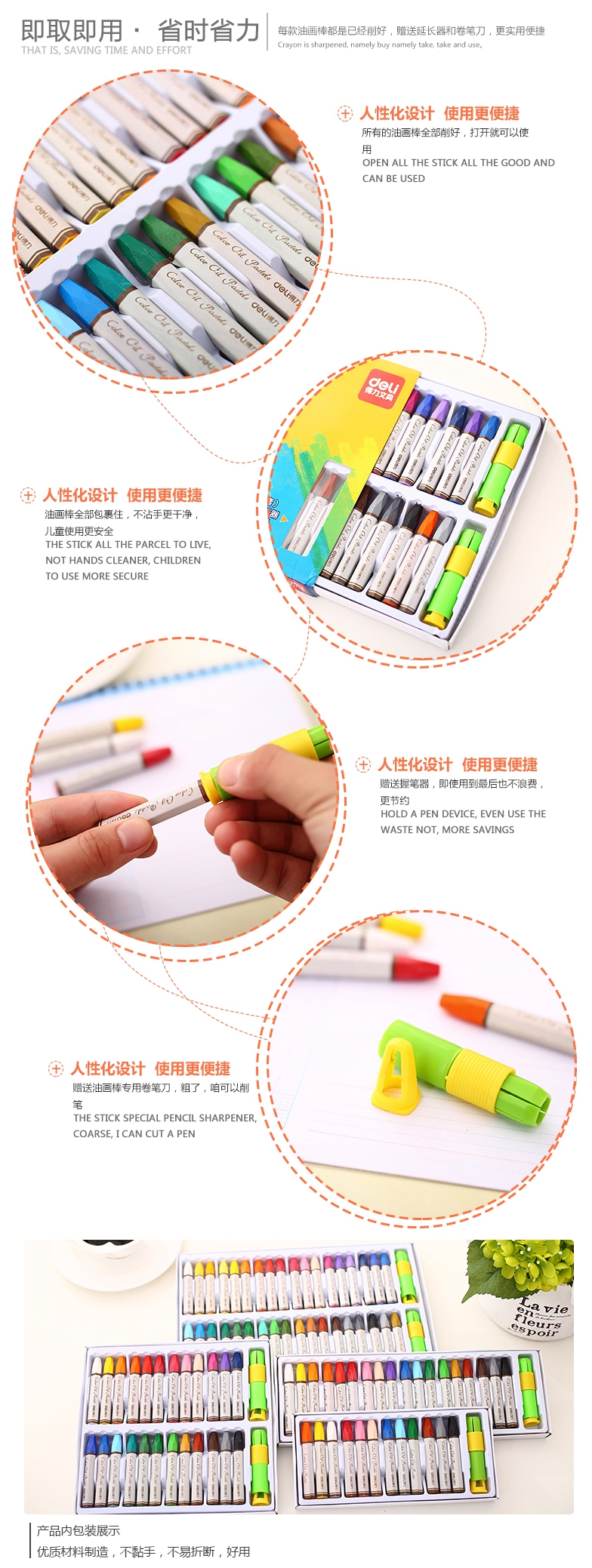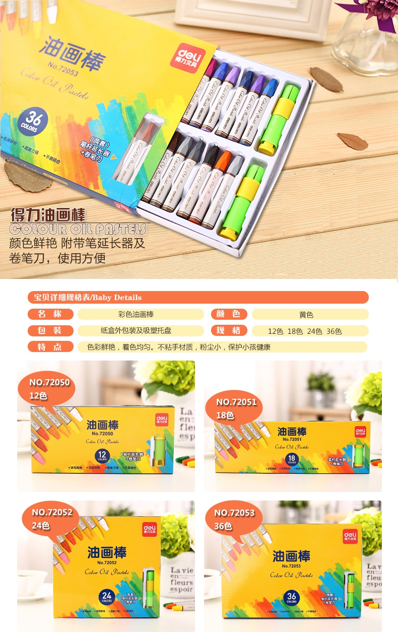 商品名称:得力72052,24色油画棒/儿童彩色绘画涂鸦画画笔美术蜡笔画笔-送专用延长器+卷笔刀 商品编号:11.05.02.72052 品牌:得力/deli 上架时间:2018-05-20 商品毛重:0克 颜色数:24色 价格单位:盒 包装含量:1/20/80 如果您发现商品信息不准确,欢迎纠错;如果您发现有比51文具价格更低的,欢迎举报