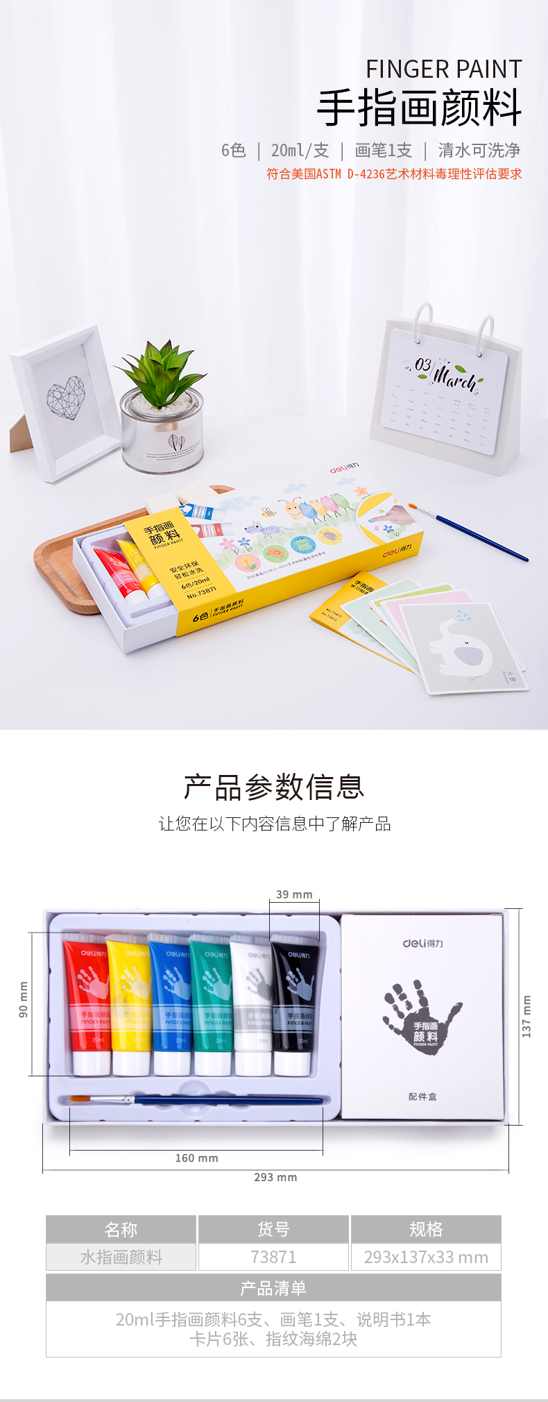 商品名称:得力73871,6色手指画颜料可水洗儿童绘画/涂鸦益智早教 商品编号:11.05.05.73871 品牌:得力/deli 上架时间:2018-05-21 商品毛重:0克 价格单位:盒 包装含量:1/12/48 如果您发现商品信息不准确,欢迎纠错;如果您发现有比51文具价格更低的,欢迎举报