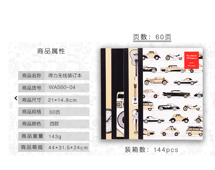 商品名称:得力WA560, A5 60张包背条本(一口价)复古风系列笔记本60页无线装订本胶装本日记本 商品编号:11.01.01.0106 品牌:得力/deli 上架时间:2018-05-23 商品毛重:0克 产品类型:无线装订 规格:A5 页数:60 含量:1/12/144 如果您发现商品信息不准确,欢迎纠错;如果您发现有比51文具价格更低的,欢迎举报
