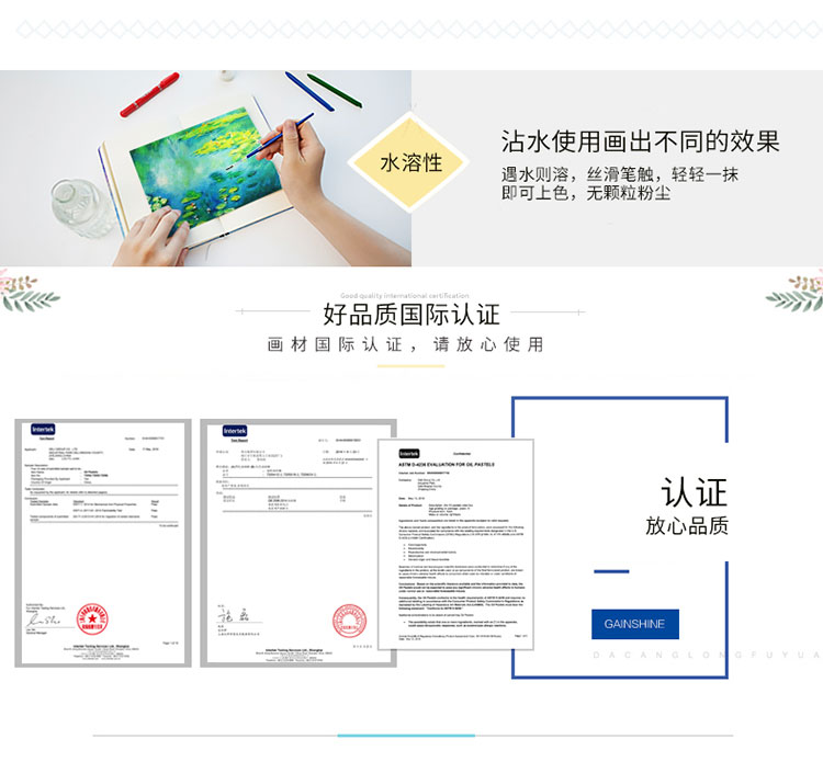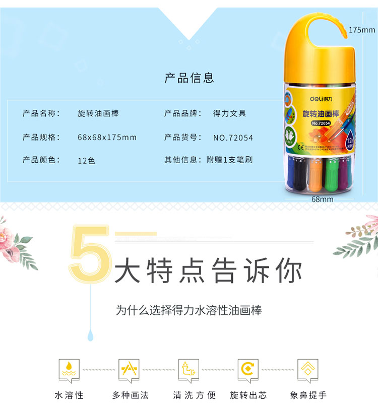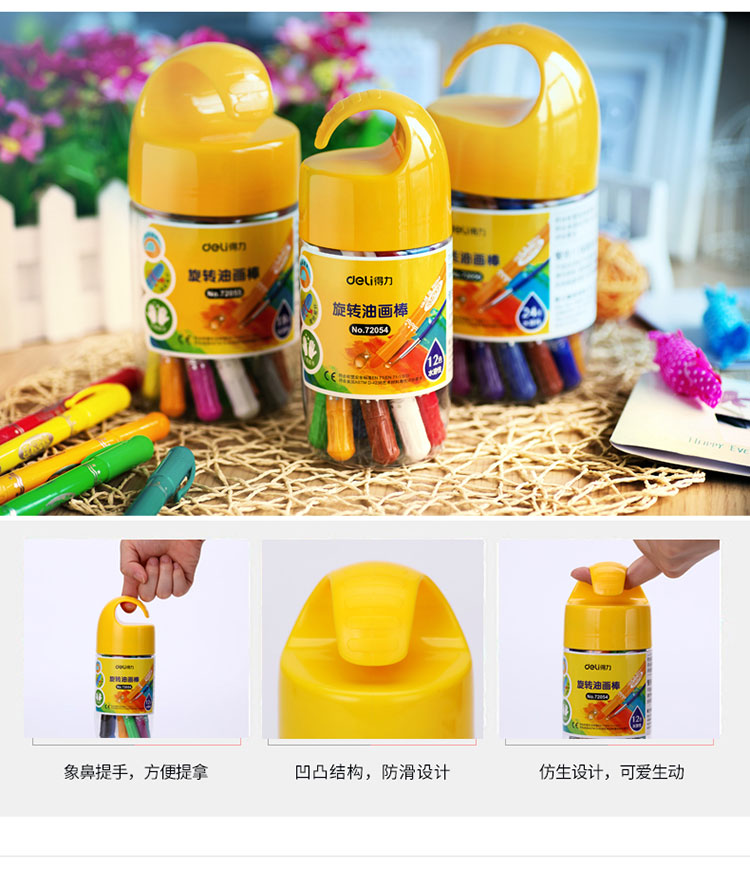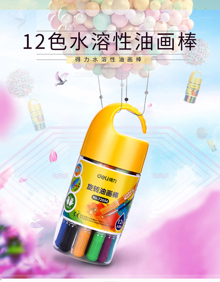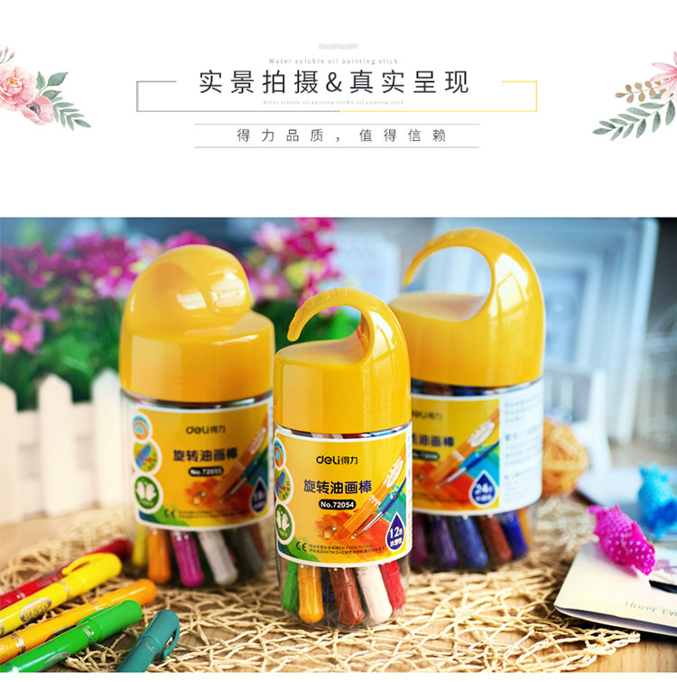 商品名称:得力72054,12色旋转油画棒/水溶性蜡笔/儿童蜡笔安全无毒可水洗 商品编号:11.05.02.72054 品牌:得力/deli 上架时间:2018-05-24 商品毛重:0克 颜色数:12色 包装含量:1/20/80 价格单位:盒 如果您发现商品信息不准确,欢迎纠错;如果您发现有比51文具价格更低的,欢迎举报