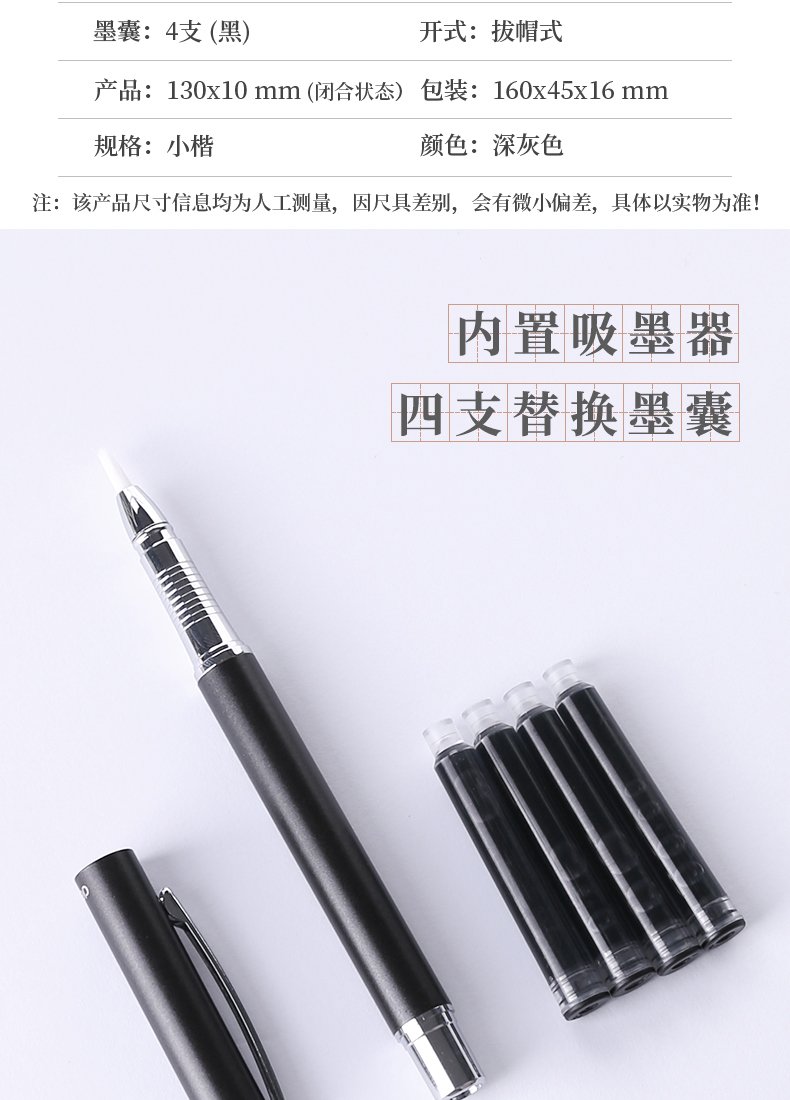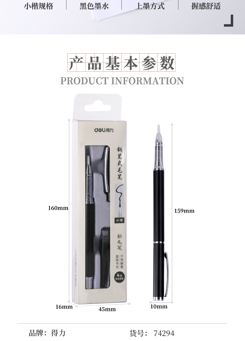 商品名称:得力74294,钢笔式毛笔软笔便携小楷软头新钢笔书法笔 商品编号:11.03.21.74294 品牌:得力/deli 上架时间:2018-06-02 商品毛重:0克 价格单位:卡 包装规格:1/12/144 如果您发现商品信息不准确,欢迎纠错;如果您发现有比51文具价格更低的,欢迎举报