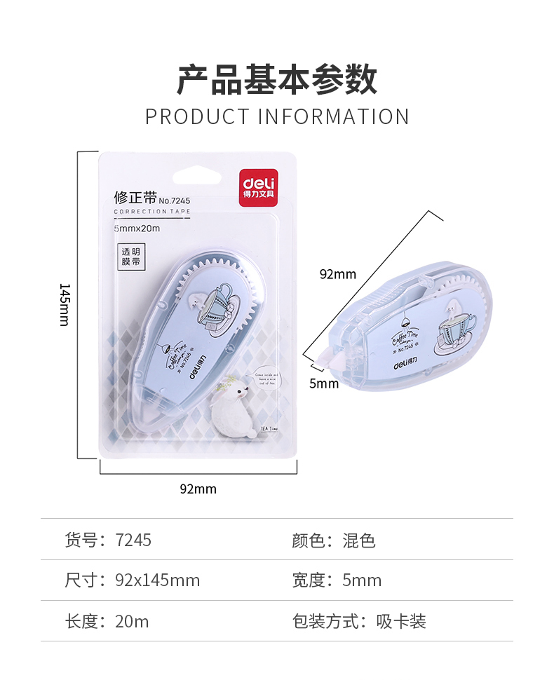 商品名称:得力7245,20m*5mm学生办公修正带/改正带/涂改带学生书写文具错别字改正带-20米 商品编号:11.13.03.7245 品牌:得力/deli 上架时间:2018-06-21 商品毛重:0克 规格:5mm*20m 含量:1/12/288 如果您发现商品信息不准确,欢迎纠错;如果您发现有比51文具价格更低的,欢迎举报