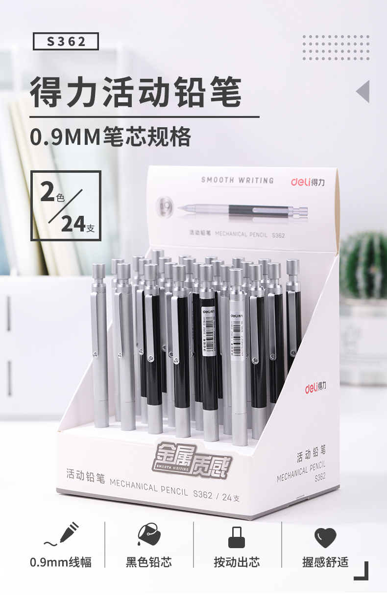 商品名称:得力S362,0.9mm绘图专用铅笔/自动铅笔 商品编号:11.03.05.0362 品牌:得力/deli 上架时间:2018-06-22 商品毛重:0克 是否带橡皮头:不带 包装方式:24/288/576 如果您发现商品信息不准确,欢迎纠错;如果您发现有比51文具价格更低的,欢迎举报