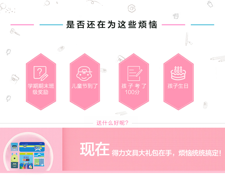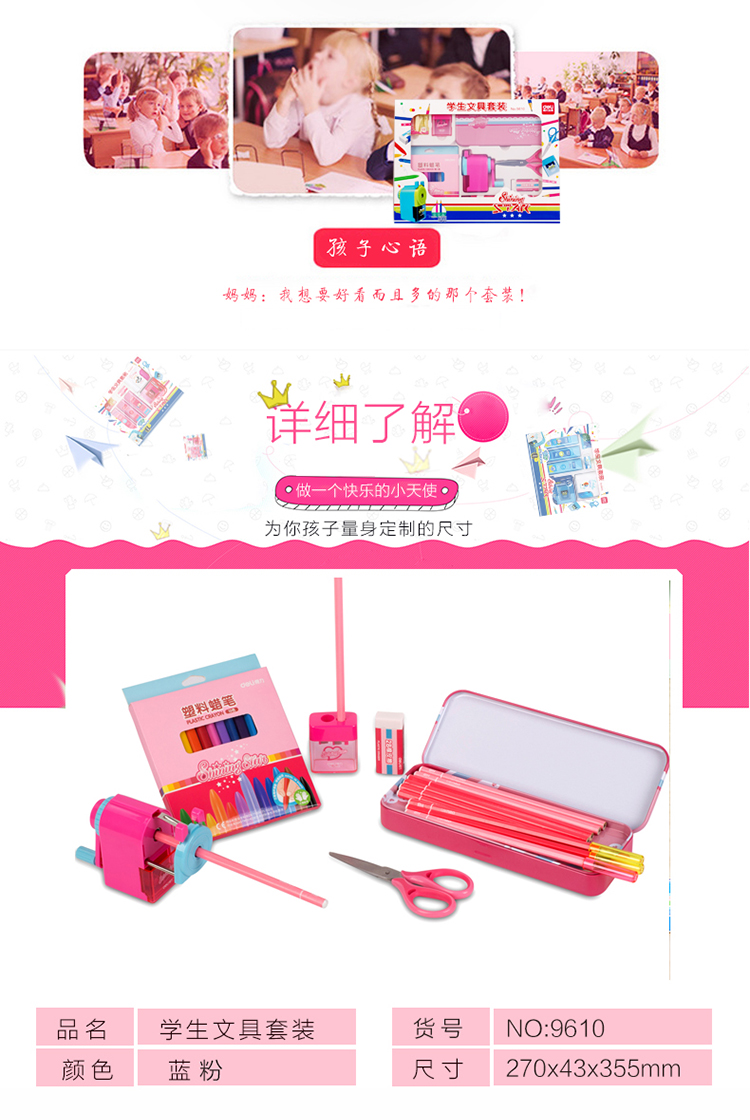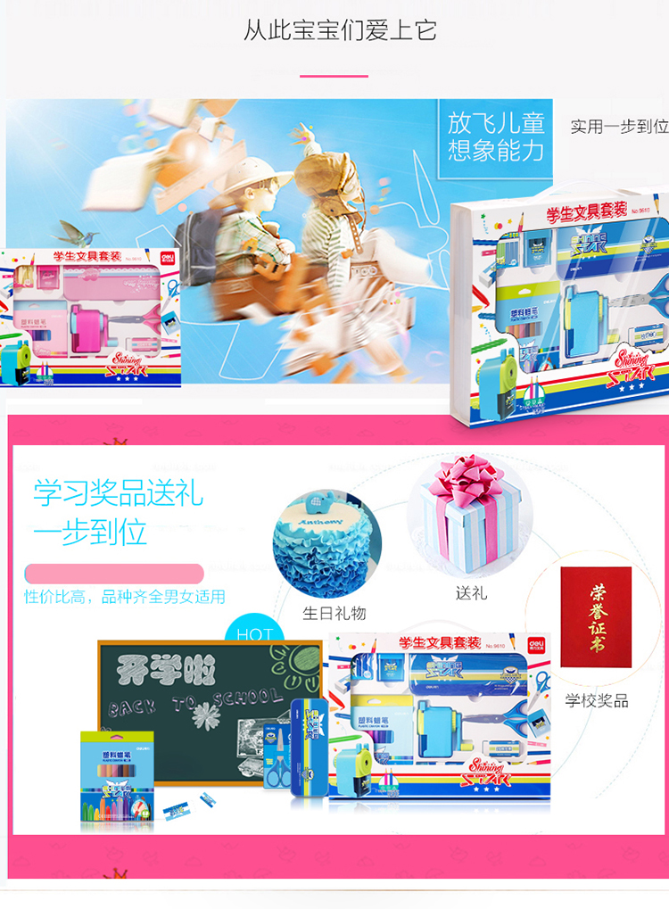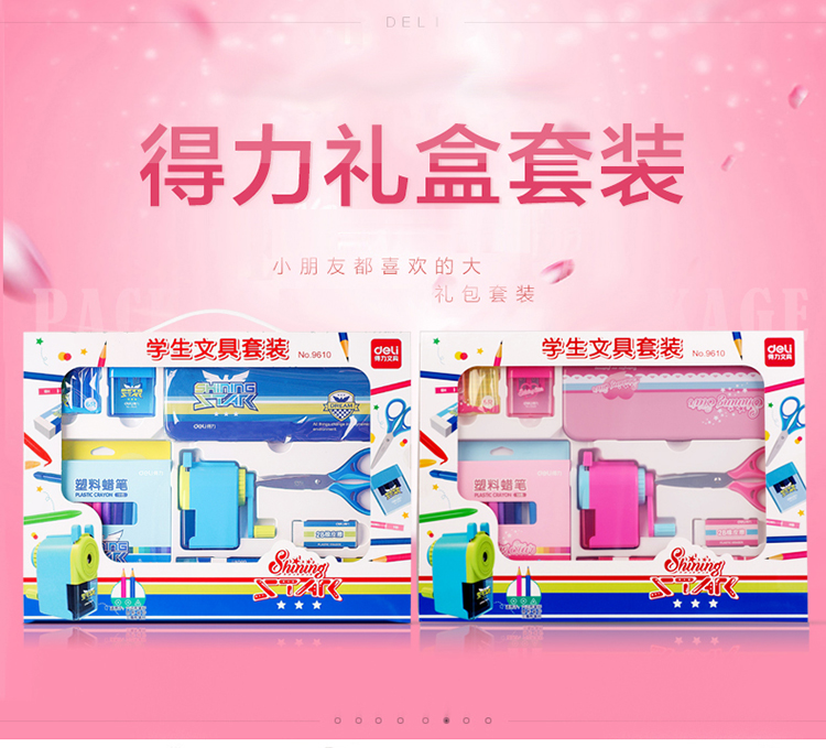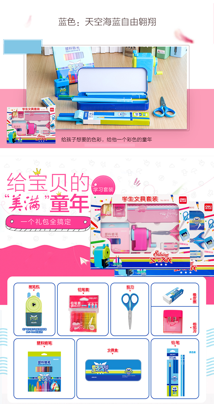 商品名称:得力9610,文具礼盒套装,儿童生日礼物小学生学习用品奖品开学大礼包 蓝色/红色8件套组合 商品编号:11.91.02.9610 品牌:得力/deli 上架时间:2018-07-02 商品毛重:0克 规格:8件套 类型:文具套装 含量:1/12 起订量:PCS 条码:6921734996107 如果您发现商品信息不准确,欢迎纠错;如果您发现有比51文具价格更低的,欢迎举报
