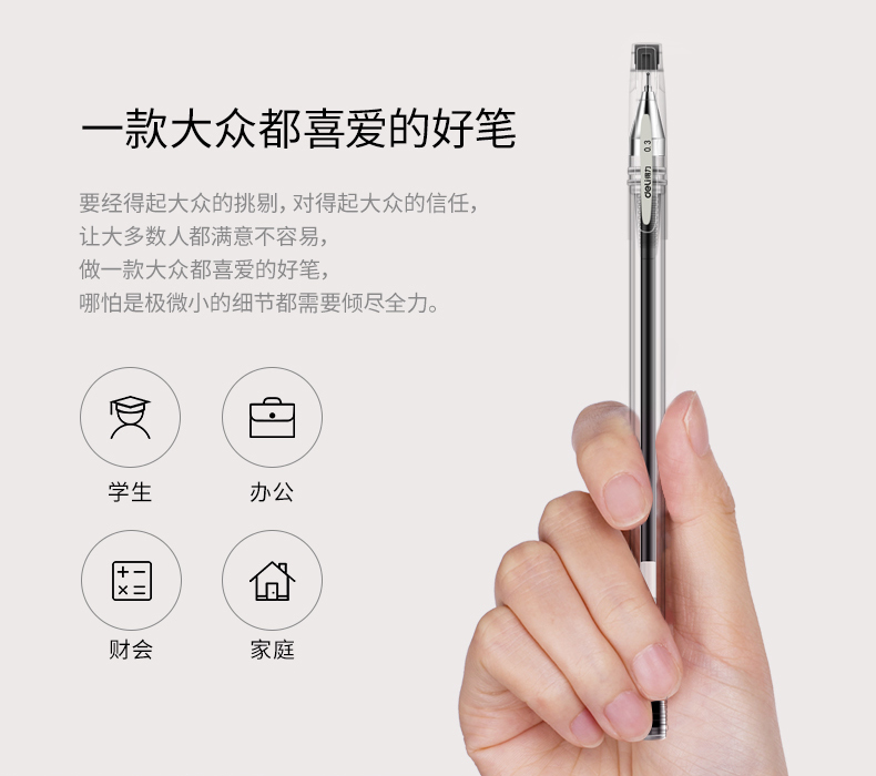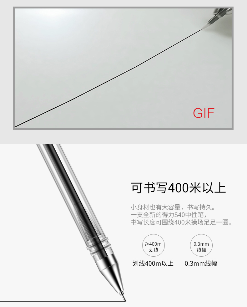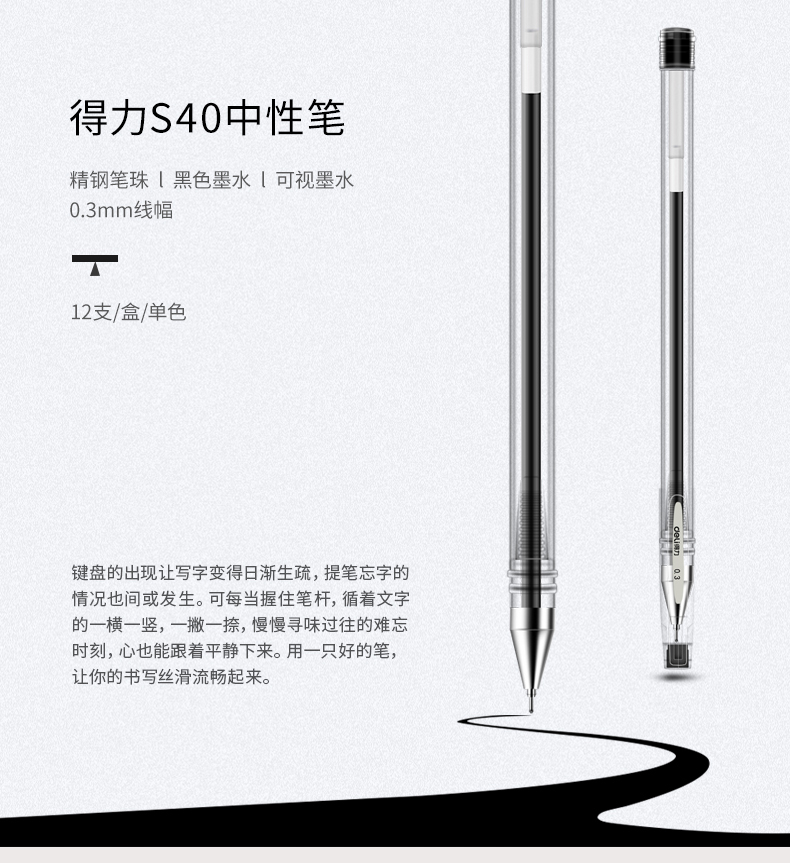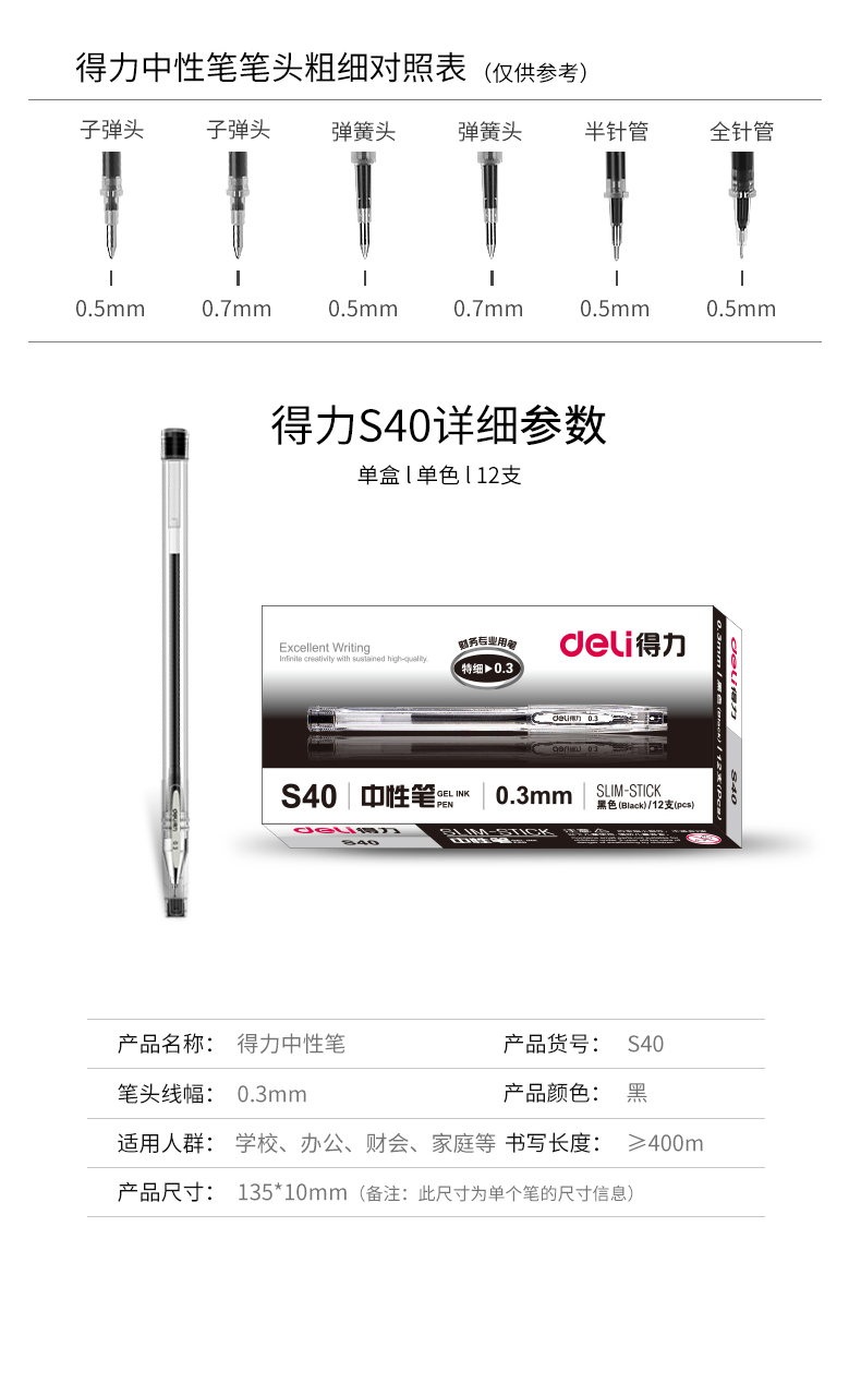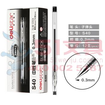 商品名称:得力S40,财务用品中性笔/学生极细中性笔 记账 碳素笔 0.3mm ,配套笔芯S750 商品编号:11.03.01.0040 品牌:得力/deli 上架时间:2018-07-03 商品毛重:0克 如果您发现商品信息不准确,欢迎纠错;如果您发现有比51文具价格更低的,欢迎举报