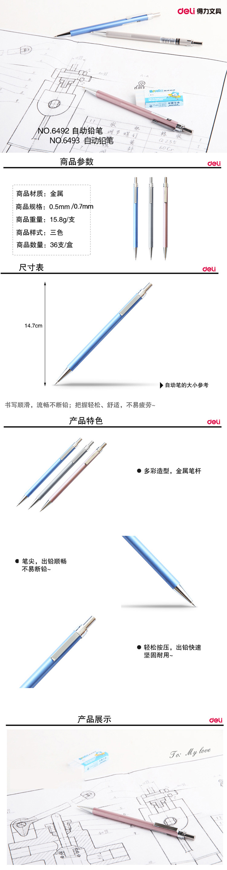 商品名称:得力6492/6493,活动铅笔创意全金属笔杆学生儿童自动铅笔学习文具-0.5mm/0.7mm 商品编号:11.03.05.6492 品牌:得力/deli 上架时间:2018-08-08 商品毛重:0克 包装含量:1/36/864 如果您发现商品信息不准确,欢迎纠错;如果您发现有比51文具价格更低的,欢迎举报
