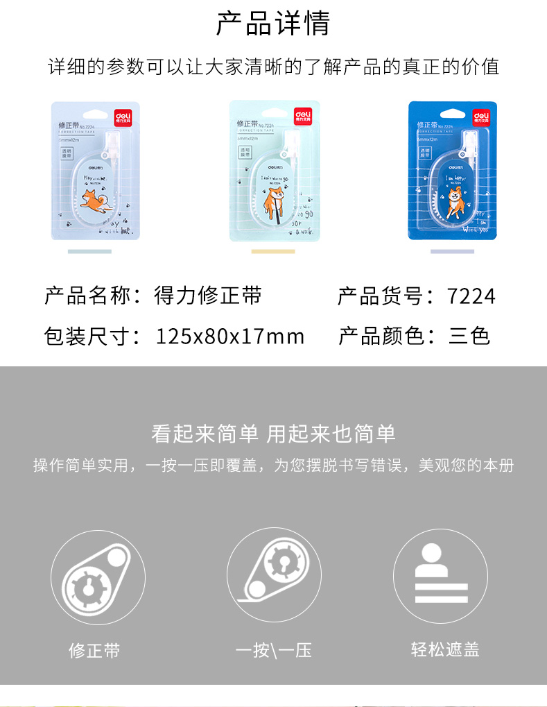 商品名称:得力7224,修正带(1/24/288) 大容量涂改带 改错带办公学习文具学生用品 -5mm*12m 商品编号:11.13.03.7224 品牌:得力/deli 上架时间:2018-08-11 商品毛重:0克 如果您发现商品信息不准确,欢迎纠错;如果您发现有比51文具价格更低的,欢迎举报