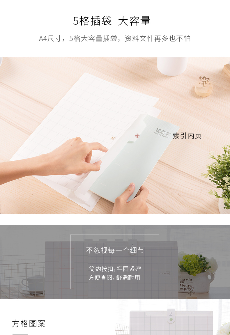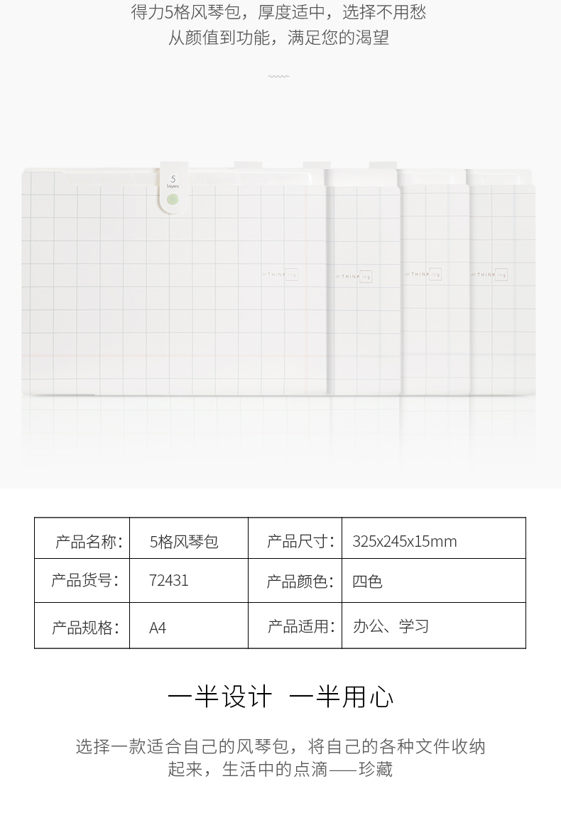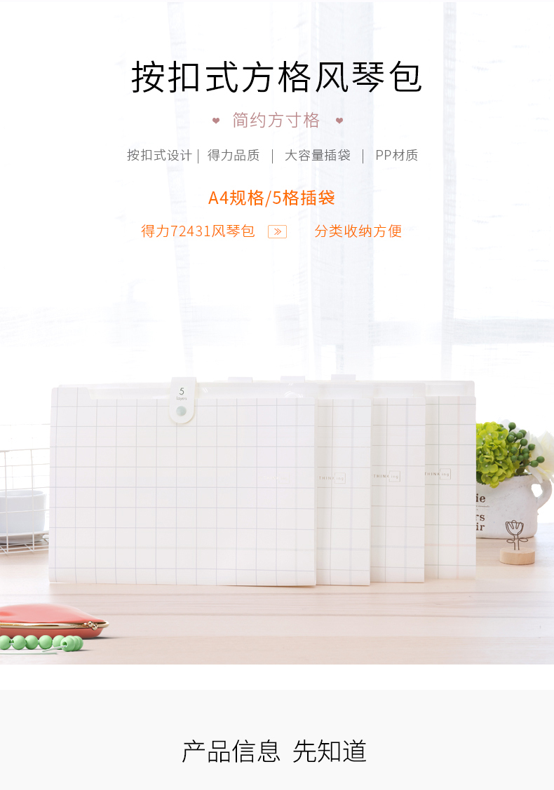 商品名称:得力72431,方寸格典雅A4风琴包暗扣5格分类收纳便携式学生风格 商品编号:11.02.05.72431 品牌:得力/deli 上架时间:2018-08-14 商品毛重:0克 规格:A4 类型:5格 含量:1/36/72 如果您发现商品信息不准确,欢迎纠错;如果您发现有比51文具价格更低的,欢迎举报